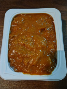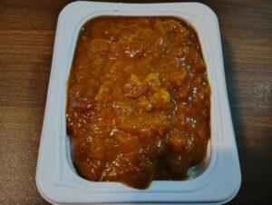 次に「レンジでぱぱっと 野菜と鶏肉のカレー(辛口)」を食べてみて感じた、見た目・具材感・辛さについてです。